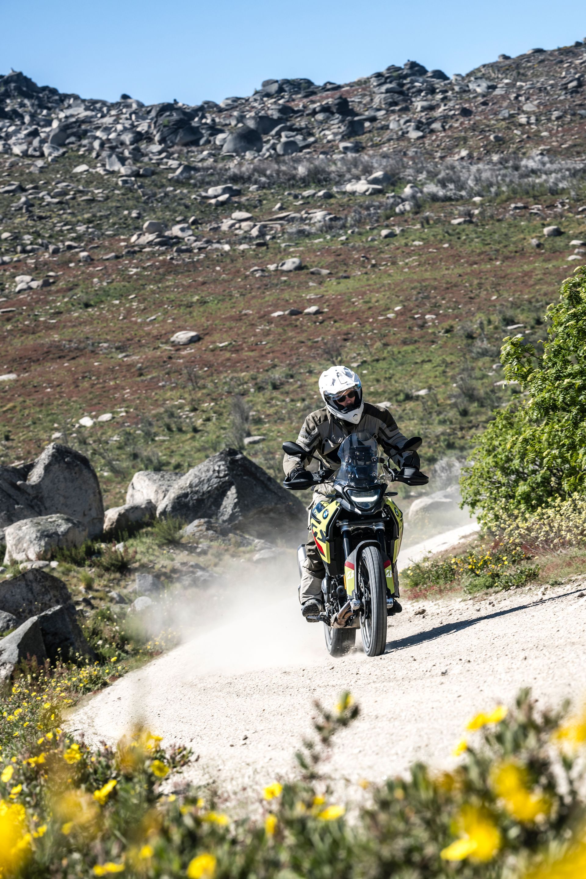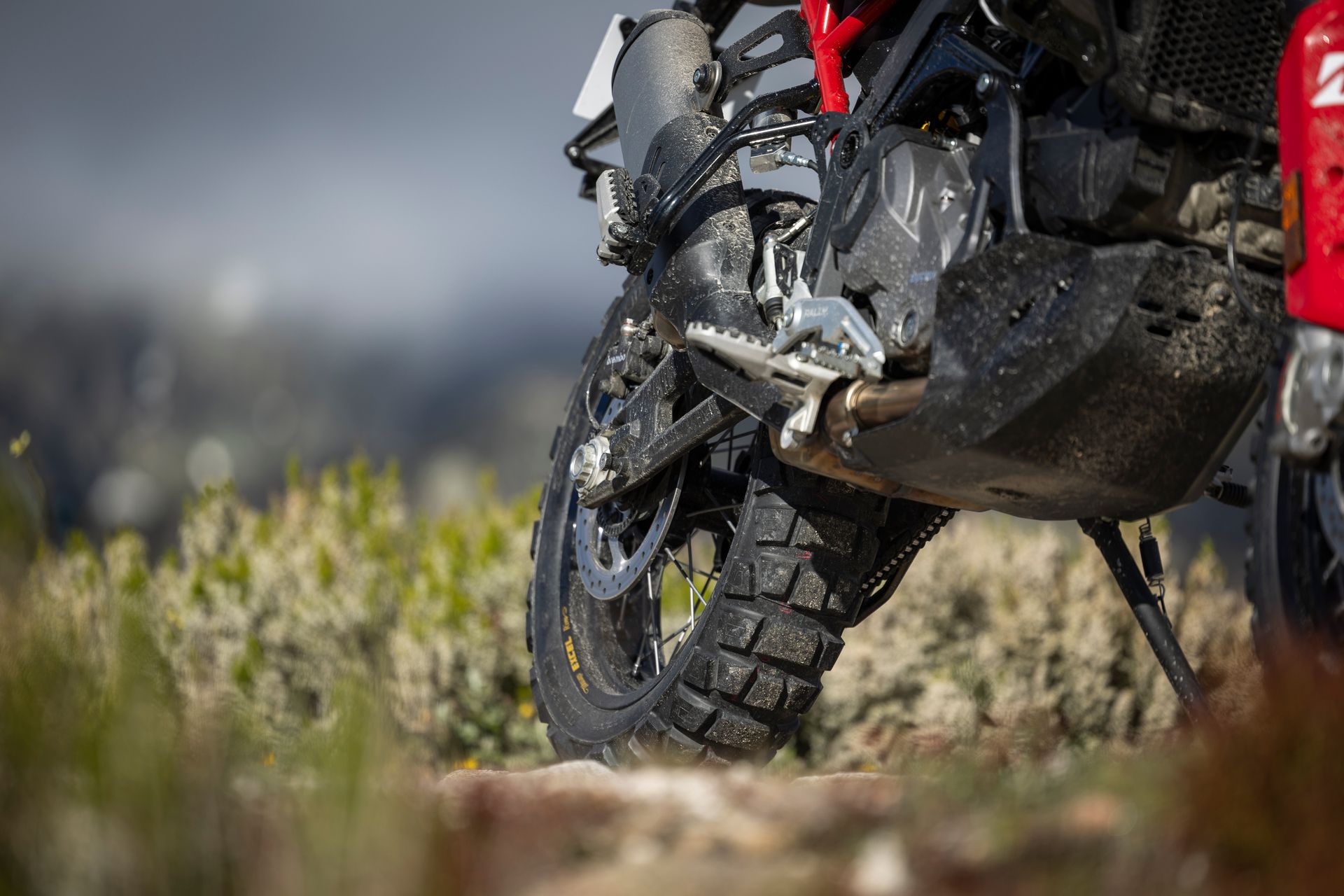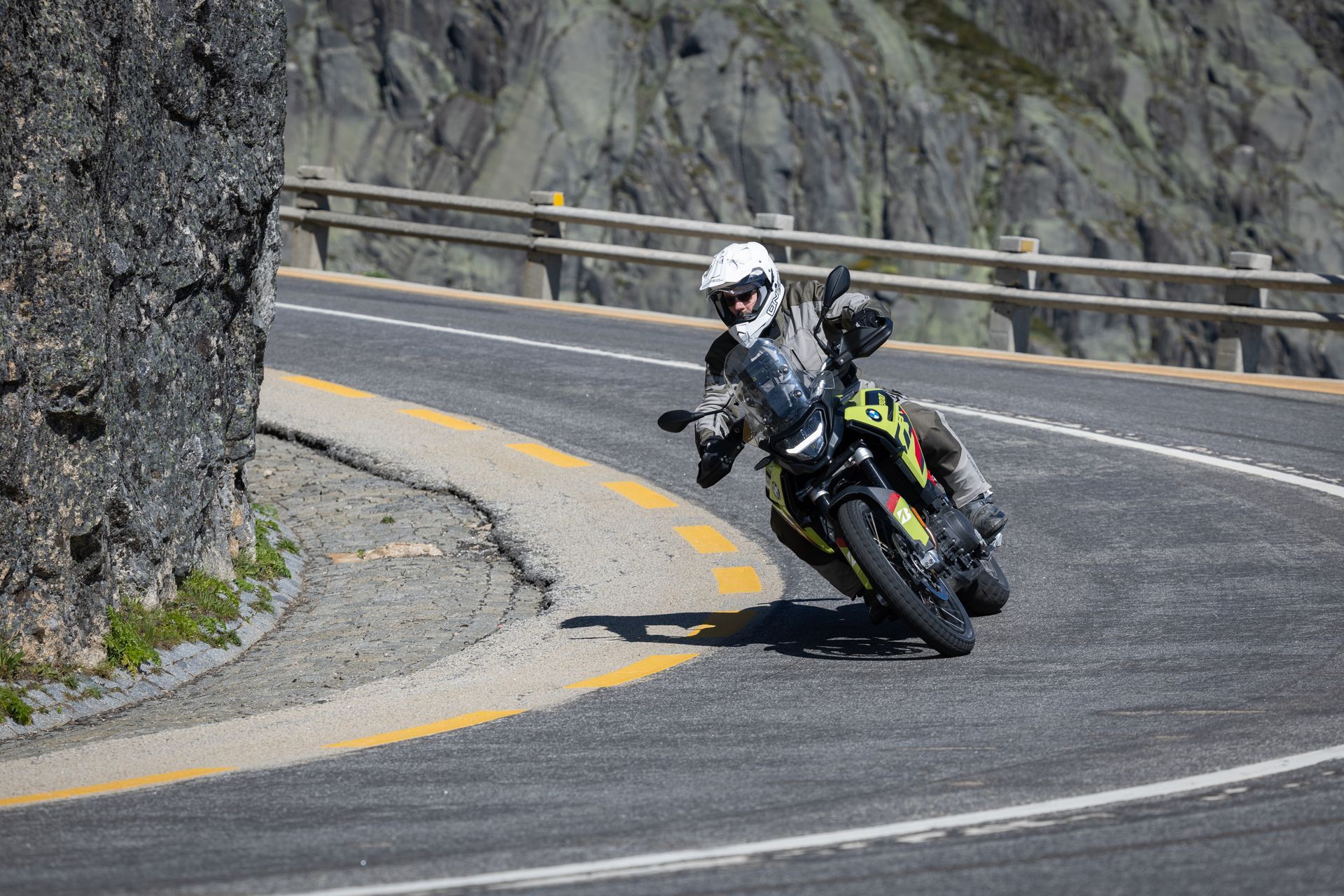 Seine stabile Karkasse bewältigt auch abseits befestigter Wege Unebenheiten und kleine Felskanten gut. Der Grip auf trockenem Schotter ist solide und, solange man nicht im Rallyetempo fährt, bleibt auch der Bremsweg positiv überschaubar.