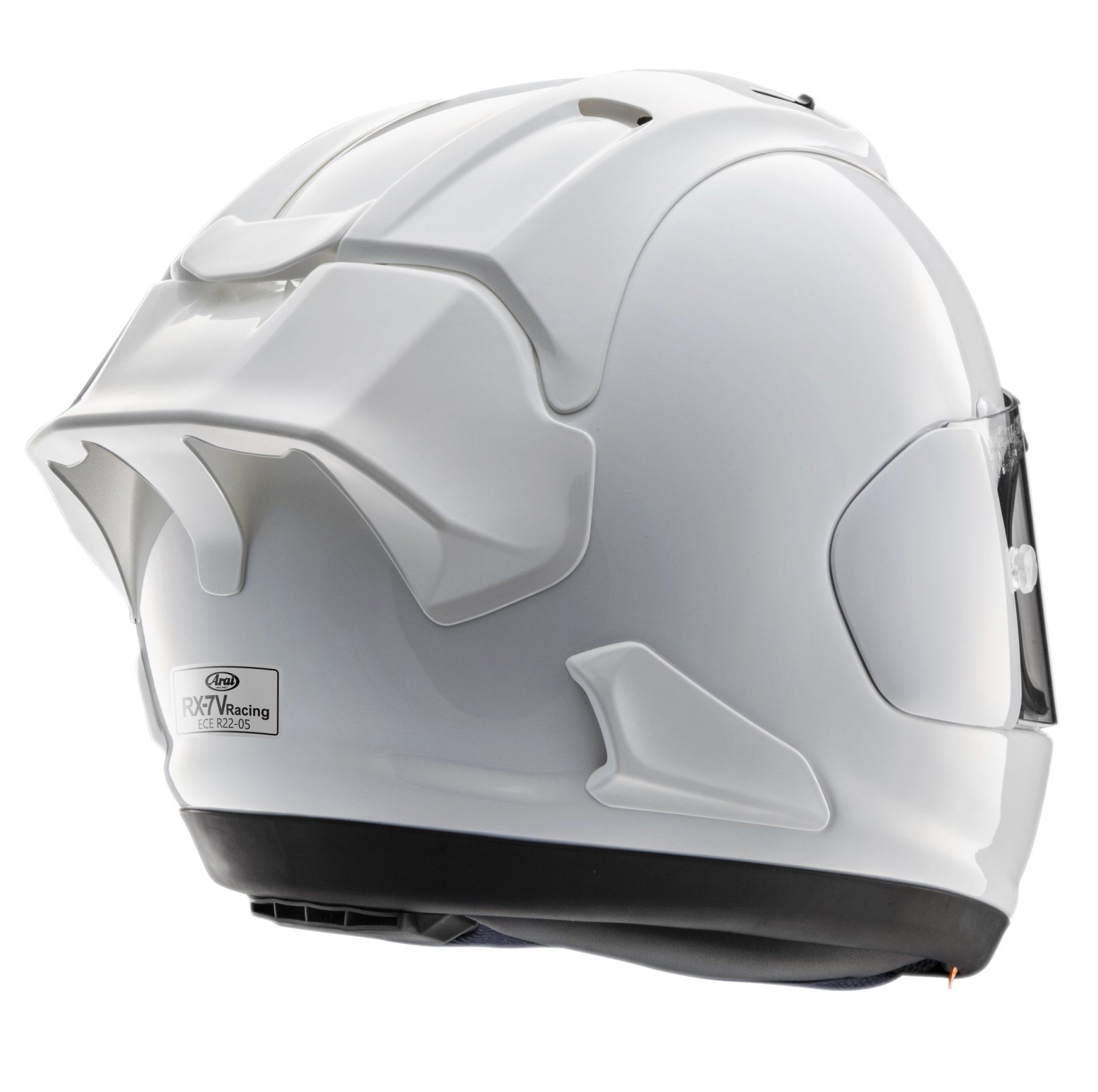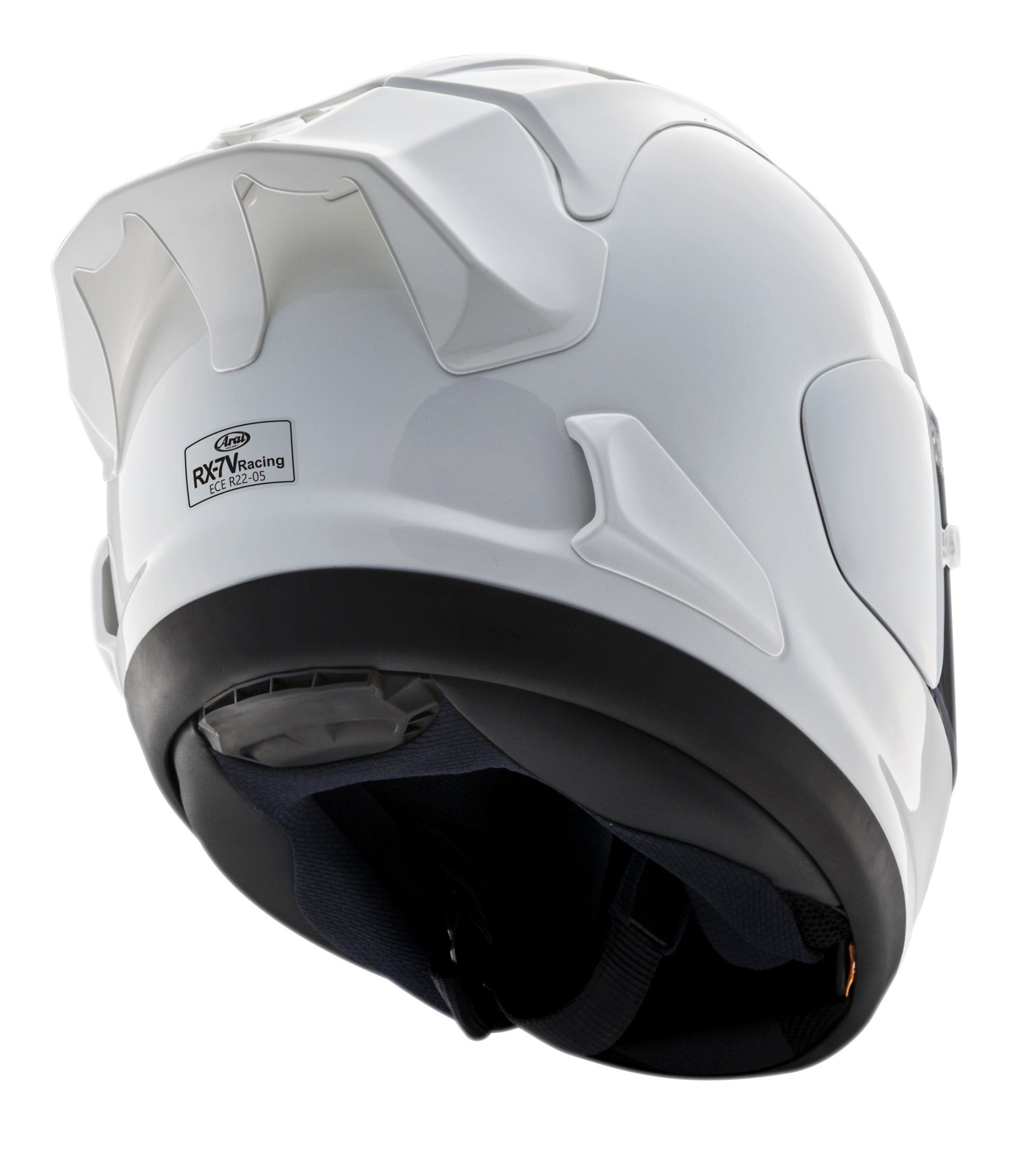 Beim RX-7V Racing wird ein von der FIM zugelassener Aero-Kit verwendet, um den Luftdurchgang zwischen der Rückseite des Helmes und dem Aero-Buckel auf der Fahrerjacke in geduckter Haltung zu erleichtern. Es handelt sich um ein neues Design mit festem Luftflügel. Es ist aerodynamischer als die Prototypen, die in den vergangenen Jahren von den hochkarätigen Arai-Rennfahrern entwickelt wurden. Je höher die Geschwindigkeit, desto deutlicher der Effekt.