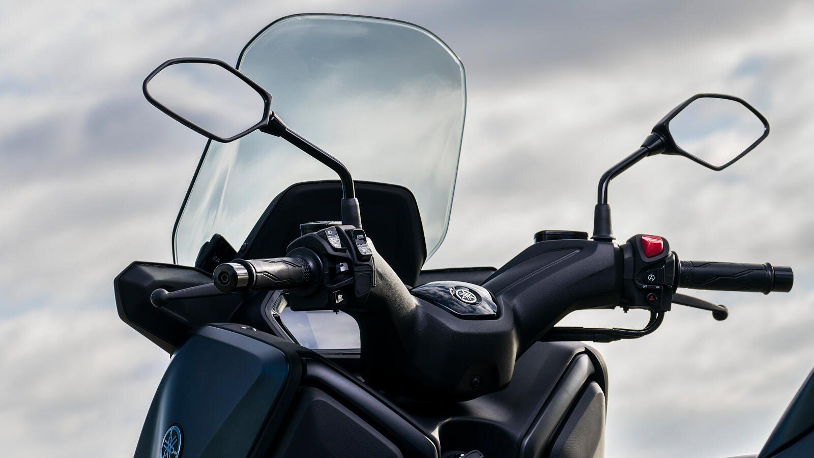 Der Roller ist außerdem mit zwei AluminiumFußplatten ausgestattet, die dem Tech MAX zusammen mit dem hochwertigen Sitzbankbezug einen exklusiven Charakter geben. Neue Aufnahmen der Scheibe und Spiegelholme aus Aluminium Der neue XMAX Tech MAX hat weiterhin eine einstellbare Verkleidungsscheibe.