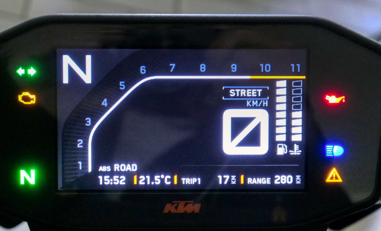 Gut gelöst hat KTM auch die Bedienung des sinnvoll aufgebauten Bordcomputers; man gewöhnt sich recht schnell an die Reihenfolge der erforderlichen Tastendrucke. Das TFT-Display hält genügend Informationen bereit; die Bedienung während der Fahrt ist (noch) okay. Ein großes Lob gilt den bei Dunkelheit hinterleuchteten Tasten und Schaltern am Lenker. Weniger gut gefällt uns, dass die Verbrauchsanzeige bis zu einem halben Liter weniger anzeigt als der Wahrheit entspricht. Auch wäre nach unserer Ansicht eine automatische Blinkerrückstellung kein Luxus.