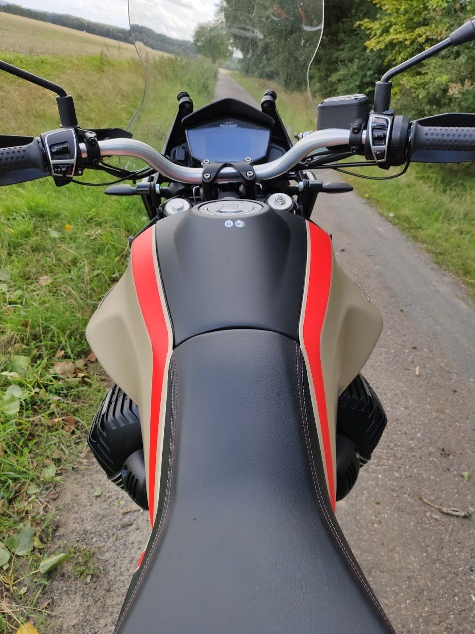Auch noch kurz testen konnte ich dann ganz ungeplant ein wenig die Offroad-Fähigkeiten. Nein, testen ist hier nicht richtig. Für eine ernsthafte Einschätzung fehlt mir dazu das passende Gelände und zudem auch Enduro-Talent, so dass hier ein Ausprobieren besser passt. Das hat sich eher zufällig ergeben, als ich vom heimischen Teutoburger Wald etwas durch die benachbarte Senne kam und hier eher zufällig einen kleinen sandigen Weg durch ein Stückchen Wald fand. Also eher ein wenig Offroad-light, aber auch diesen kleinen Abstecher meisterte die Guzzi ganz souverän. Die Michelin Anakee Adventure kamen mit diesem Untergrund bestens zurecht und funktionierten auch auf der Straße prima, also insgesamt eine gute Reifenwahl der Italiener.