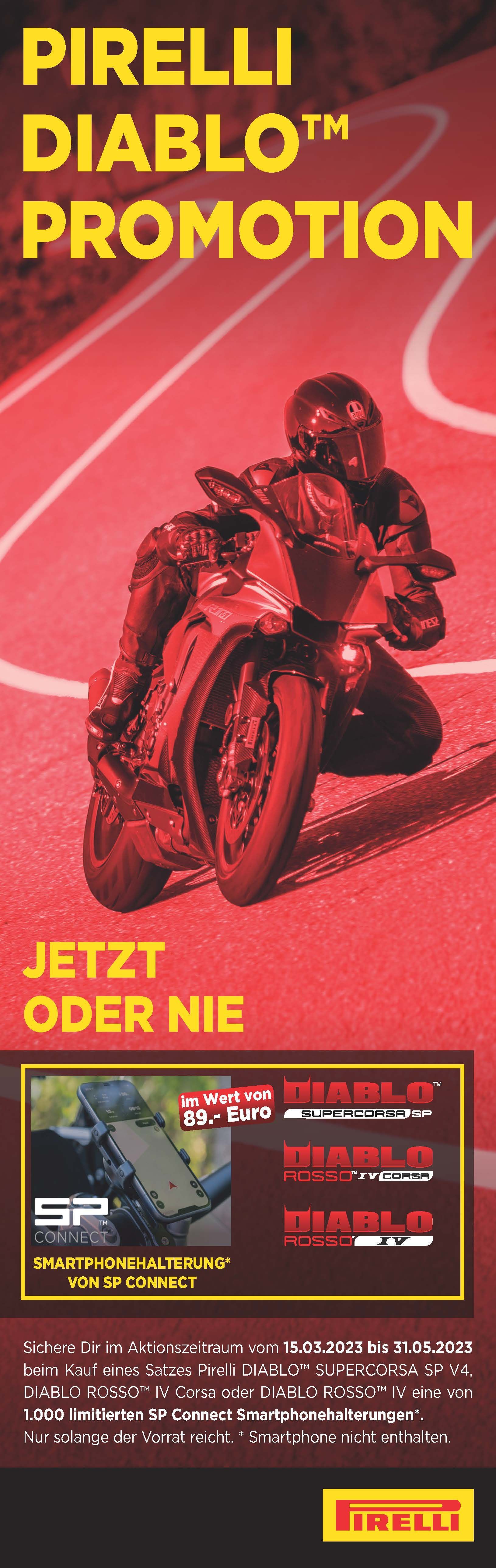 Die Pirelli DIABLO™ Promotion läuft vom 15. März bis 31. Mai 2023. Beim Kauf eines Satzes der Supersport-Reifen DIABLO™ SUPERCORSA SP V4, DIABLO ROSSO™ IV Corsa oder DIABLO ROSSO™ IV winkt mit einer Smartphone-Halterung von SP Connect im Wert von 89 Euro eine hochwertige Prämie.