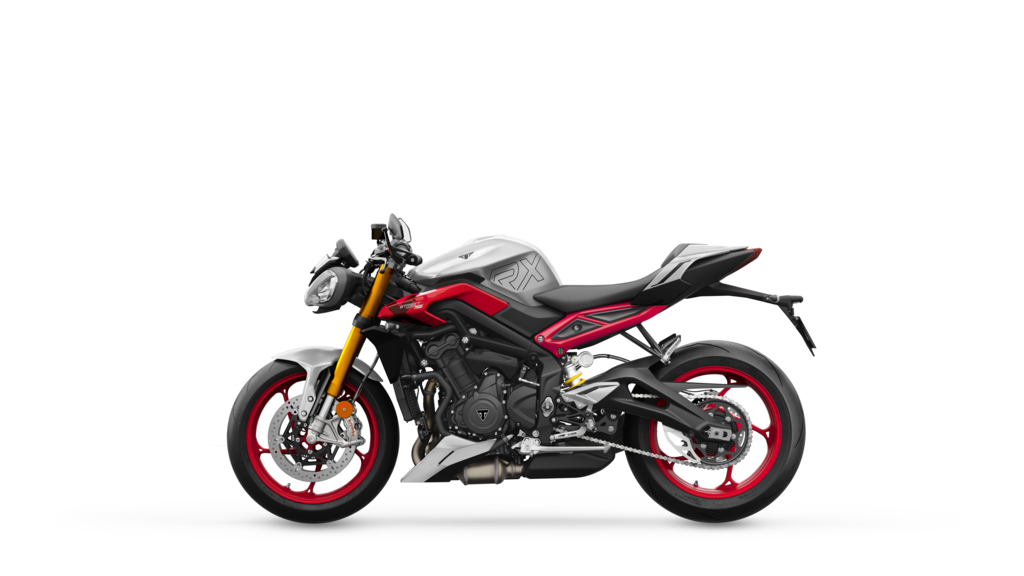 Die RX zeichnet sich durch eine Reihe exklusiver Designdetails aus, darunter eine präzisionsgefertigte obere Gabelbrücke, ein lasergraviertes RX-Logo auf dem Schalldämpfer und ein spezieller Sitz mit RX-Logo. Die auffällige Lackierung in Matt Aluminium Silver wird mit einem markanten Heckrahmen in Diablo Red und passenden Rädern kombiniert, wodurch eine dynamische, von der Rennstrecke inspirierte Ästhetik entsteht. Dieses unverwechselbare Design ist eine Hommage an die ursprüngliche Street Triple 675 RX.