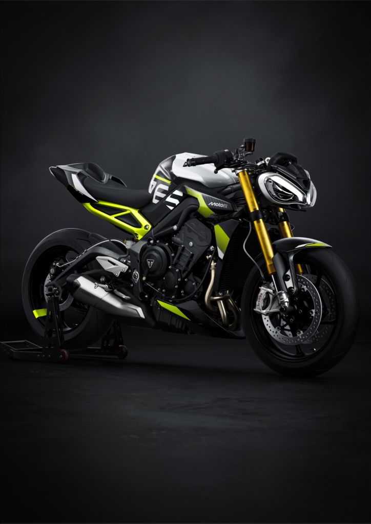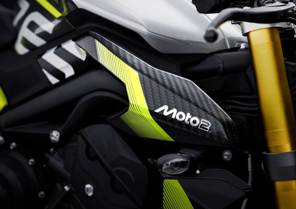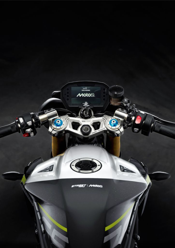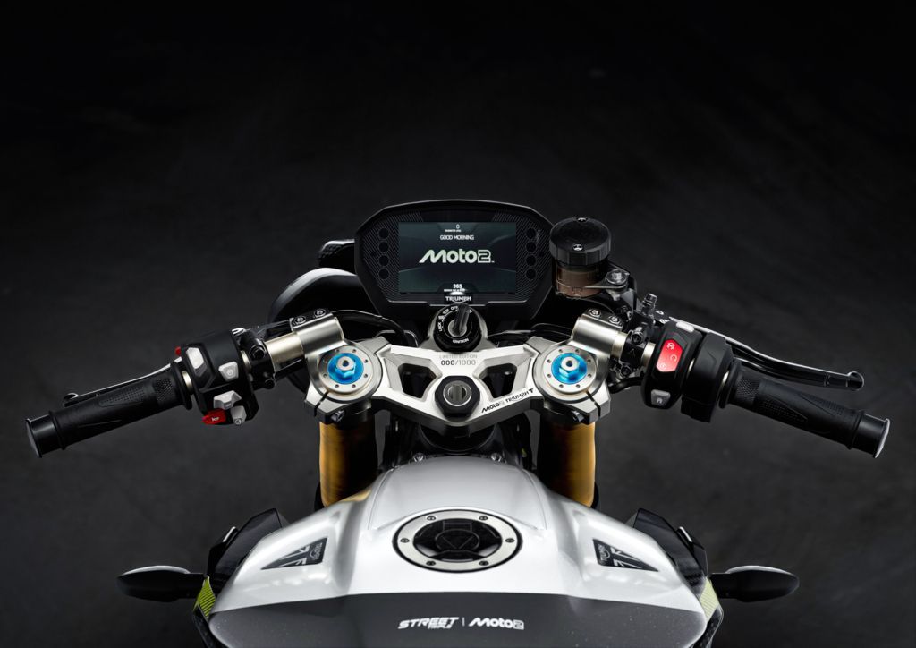 Außerdem hat diese Edition einen Sitz mit Moto2™-Prägung und einem extra-griffigen Bezug, ein neues, klares Rücklicht sowie ein lasergraviertes Moto2™-Logo auf dem Schalldämpfer. Die auffällige Farbgebung in Mineral Grey und Crystal White wird durch einen Heckrahmen und Akzente in leuchtendem TRIUMPH Performance Yellow und einen passenden Streifen auf dem Hinterrad ergänzt, die für einen unverwechselbaren, vom Rennsport inspirierten Look sorgen. Jedes Motorrad ist auf einer gefrästen oberen Gabelbrücke, die ebenfalls das Moto2™-Logo trägt, individuell nummeriert. Darüber befindet sich ein TFT-Display, das als Startbildschirm das Moto2™-Logo zeigt. Das unterstreicht den Status des Bikes als limitierte Auflage und die Attraktivität für Sammler.