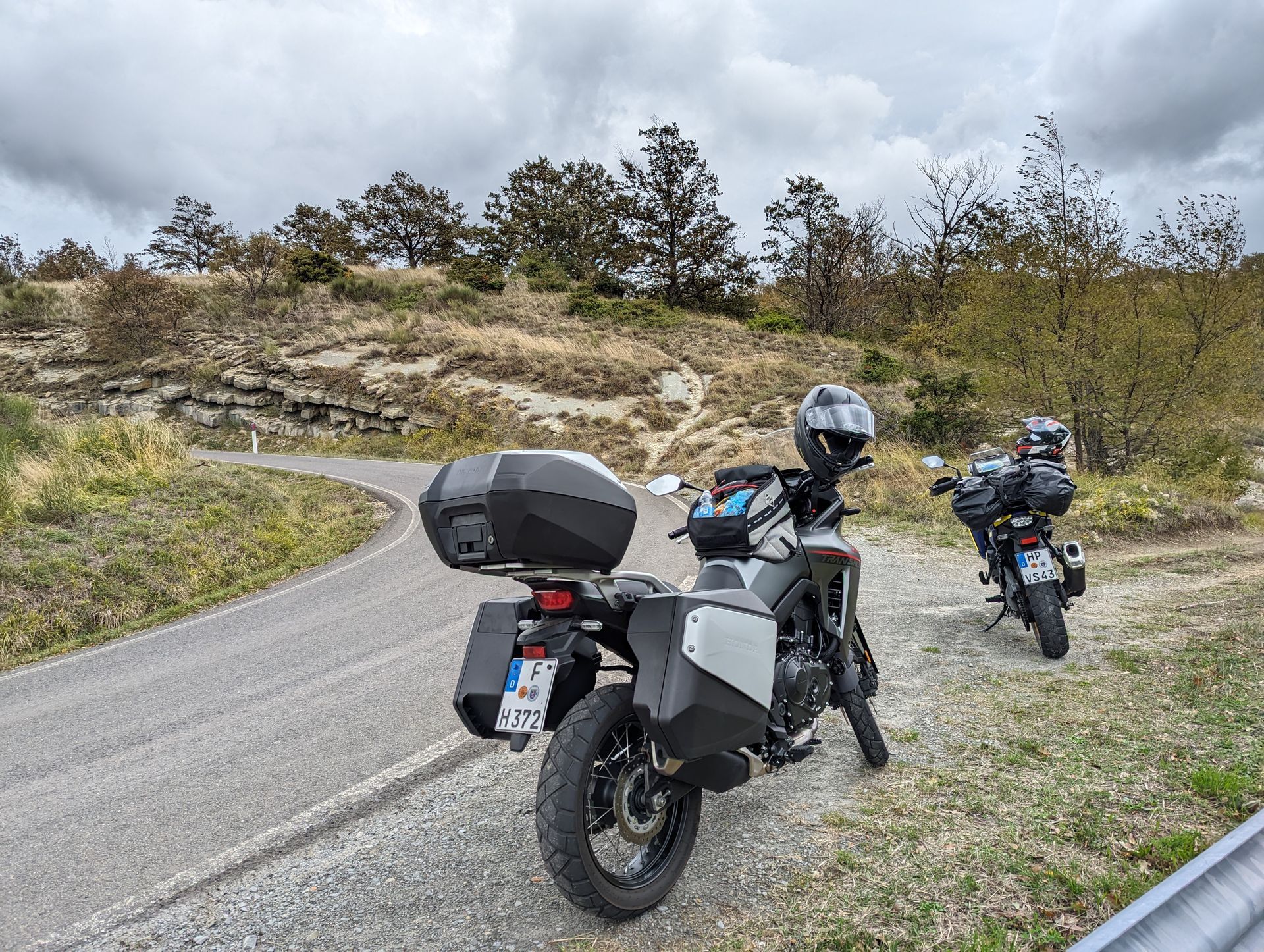 Hier hinterlässt die Transalp mit der deutlich komfortablen Grundabstimmung einen geschmeidigeren Eindruck. Das gleiche Bild bot sich uns abseits des Asphaltbandes. Wobei es sich hierbei um Schotterwege handelte, also nicht wirklich anspruchsvolles in Sachen “offroad”, auch wenn manche Bereiche recht locker waren und nicht wie meistens überwiegend festgefahren. Trotzdem wirkte auch gerade hier die Honda etwas souveräner. Das mag primär an dem deutlich niedrigeren Gewicht liegen, wohl weniger an der etwas ungewöhnlichen Reifenkombination von 21” vorne und 17” hinten. Wenn man das Suzuki-Fahrwerk gescheit einstellt, mag sich das Bild aber wenden, wer weiß.
