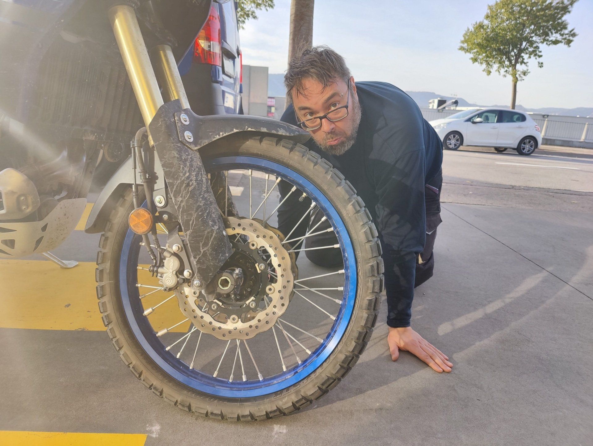 Die Eckdaten: Vollgetankt 204kg, Offroad-übliche Bereifung mit (90/90) 21” Vorderrad und (150/70) 18” hinten, dazu Federwege von 210/200mm, Stahlrohrrahmen, 16l Tank, steiles Windschild, Handprotektoren und Motorschutzblech. Der Antrieb liefert 54kW (73PS) bei 9000 1/min und hat ein max. Drehmoment von 68Nm bei 6500 1/min. Bereift kommt unsere Testmaschine mit den Serienpneus Pirelli Scorpion Rally STR daher. Auch wenn die Reifen mit “Tubeless”, also schlauchlos gelabelt sind, ist hier ein Schlauch auf den Felgen im Einsatz. (Diese Info habe ich daher, weil ich auf dieser Tour vorne einen Plattfuß hatte)