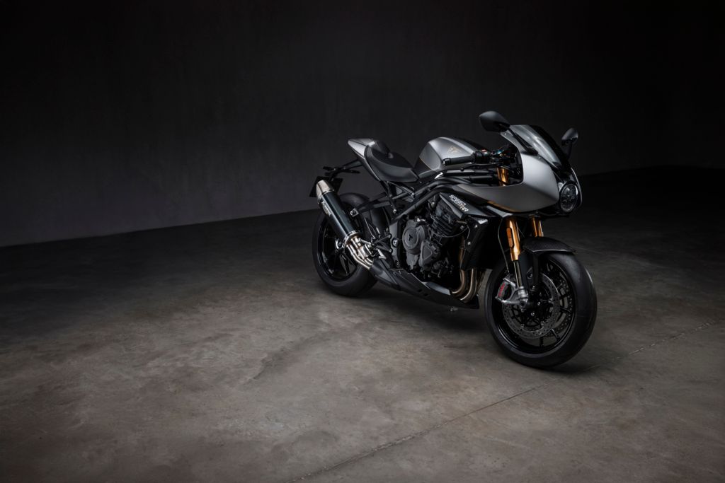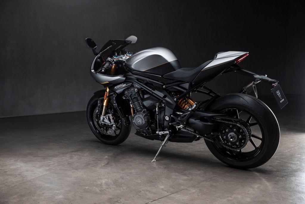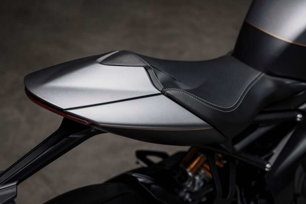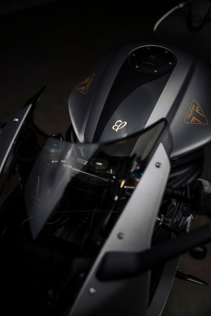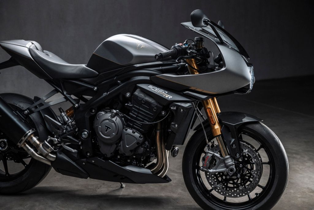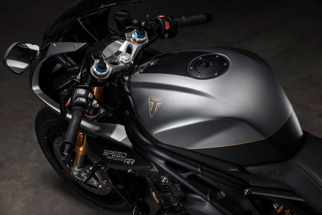 Die auf nur 270 Stück weltweit limitierte Auflage der neuen Speed Triple-Sonderserie verfügt über eine spezielle Zweifarb-Lackierung inklusive handgemalten Premium-Golddetails, einen Ledersitz mit „französisch“ ausgeführten Nähten, einen exklusiven Auspuffendtopf von Akrapovič sowie zahlreiche ultraleichte Teile aus Kohlefaser.