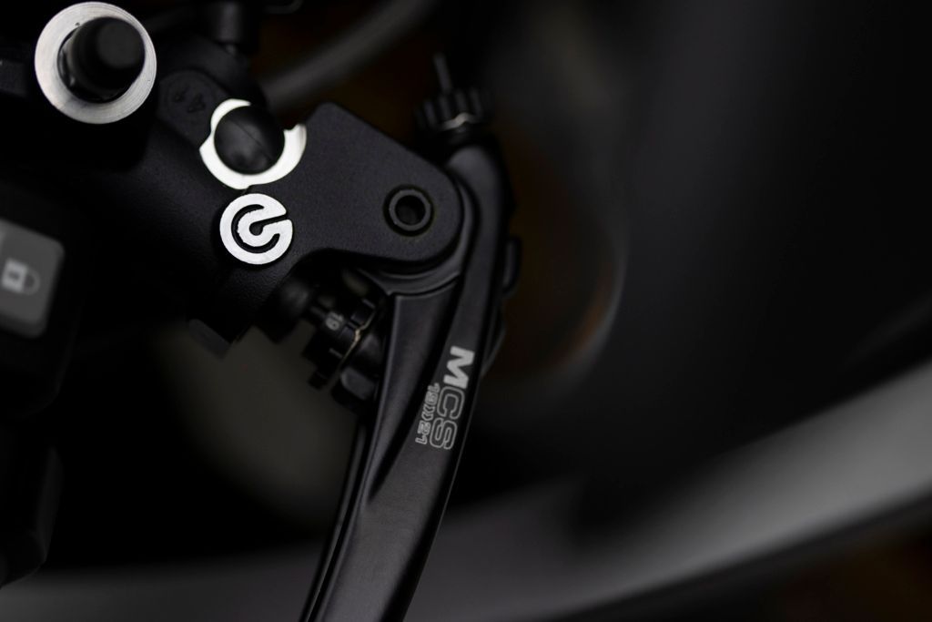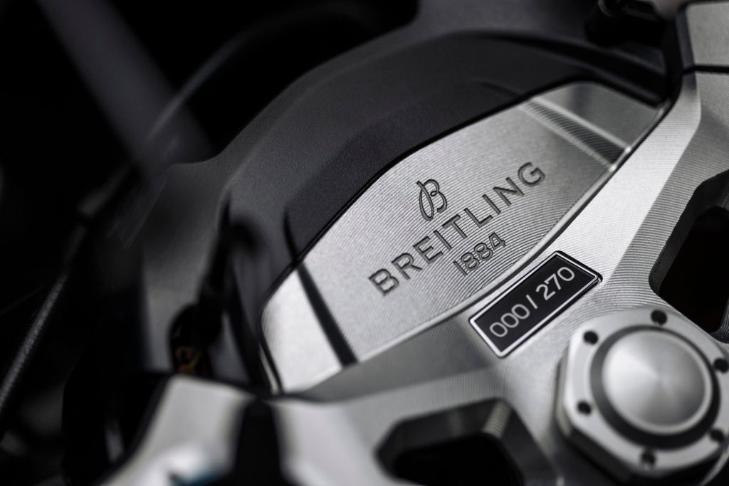 Der Kooperationspartner Breitling ist in einer Reihe von Details auf dem Motorrad präsent: So gibt es einen speziell programmierten Breitling-Startbildschirm, ein gelasertes Breitling-Logo auf der gefrästen Abdeckung der Hinterradnabe sowie eine markante goldene Breitling-Plakette auf dem Tank.