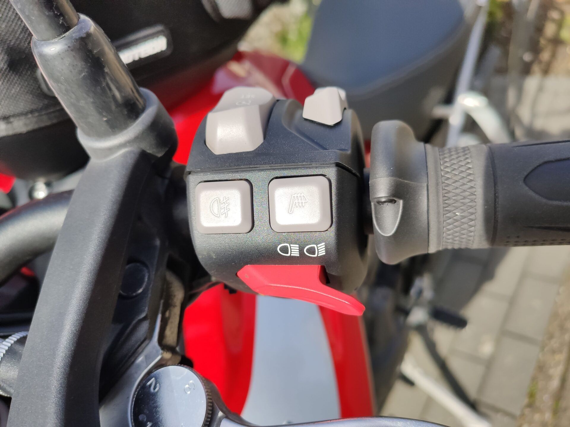 Ich blättere mich erst einmal etwas durch die Funktionen des riesigen 7“ Displays, dieses gehört zu den aktuell größten Modellen auf dem Markt. Super abzulesen, alle wichtigen Infos klar zu erkennen und diverse Skins nach persönlicher Vorliebe gibt es auch. Der Joystick für die Menüführung wird mit dem linken Daumen bedient. Das ist hin und wieder etwas fummelig (beim Drücken für Bestätigung erwischt man auch schon mal eine Bewegung in eine Richtung), aber im Großen und Ganzen ist es hinreichend simple und selbsterklärend. Das etwas diffuse Schaltergefühl bleibt übrigens beim Blinkerhebel vorhanden, auch der lässt einen knackigen Druckpunkt vermissen. Da haben die älteren mechanischen Schalter ja doch öfters noch etwas mehr Haptik zu bieten.