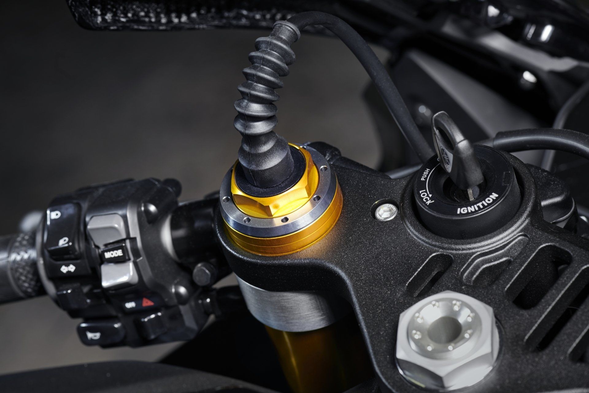In Ergänzung zu den Verbesserungen bei der Vorderrad-Federung erhielt das elektronische ÖhlinsFederbein eine modifizierte Einstellung für die Federvorspannung.