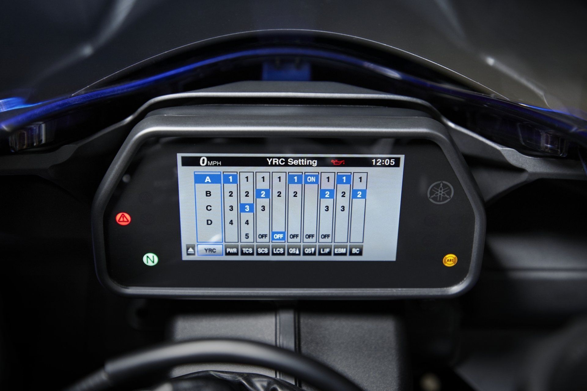 Die vollständig ausgerüstete TFT-Flüssigkristall-Cockpit (Thin Film Transistor) der YZF-R1 wurde mit Anzeigen um die neuen Funktionen „Bremssteuerung" (BC) und „Motorbremsmanagement" (EBM) erweitert.